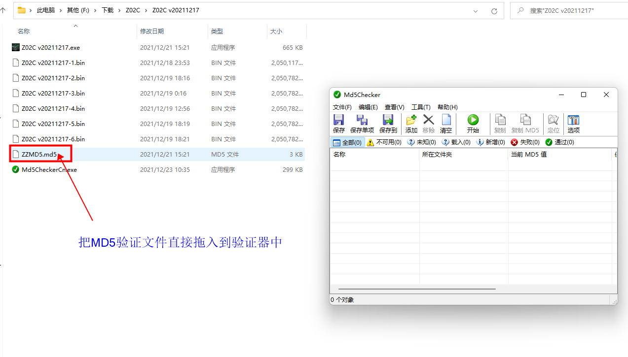 将下载好的效验软件复制或者剪切至下载的游戏文件夹里,然后打开效验软件,并且将文件夹里的ZZMD5拖入效验软件,拖入后会自行进行检验