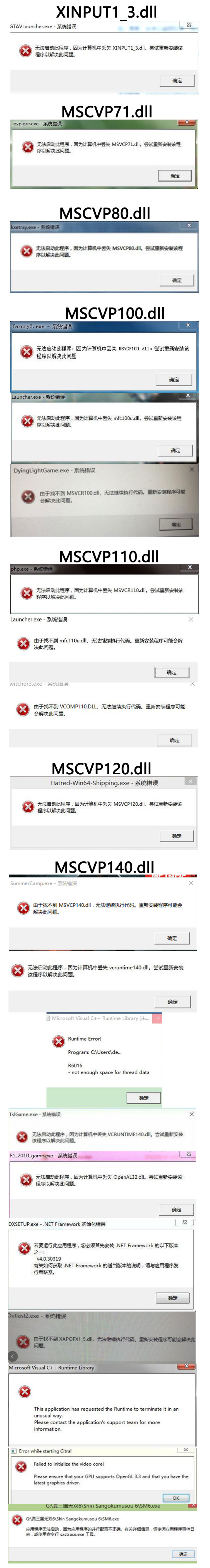 提示丢失:MSVCP100/110/120/140/XINPU1_3.DLL/MSCVP71.dll等相关问题解决方法